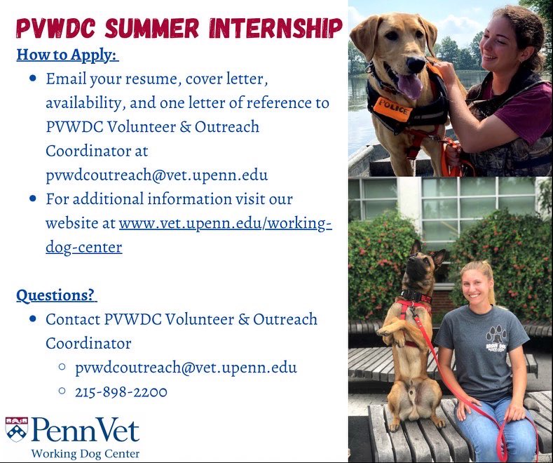 Find Your Dream Job Near You Today. Summer Intern at Penn Vet Working Dog Center This internship gives me the opportunity to train dogs for specific scent-detection jobs including Dual-Purpose Police K9s Single-Purpose Scent Detection dogs Urban Search and Rescue dogs and Medical Detection dogs. The Penn Vet Working Dog Center developed this program to address the needs of working dog handlers trainers and programs for simple effective and efficient methods to develop and assess working dog physical fitness.