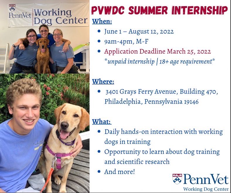 Ad Major US Companies Are Hiring Now and Increasing Pay. Starting in 2010 we have been hosting this gathering of working dog professionals including veterinarians academics working dog handlers breeders students behaviorists and those interested in what makes a better working dog. Our internship program is designed for students with a serious interest in working dogs to gain practical experience while helping the Penn Vet Working Dog Center achieve our mission of developing a detection dog breedingtraining program that will implement test and disseminate the knowledge gained.